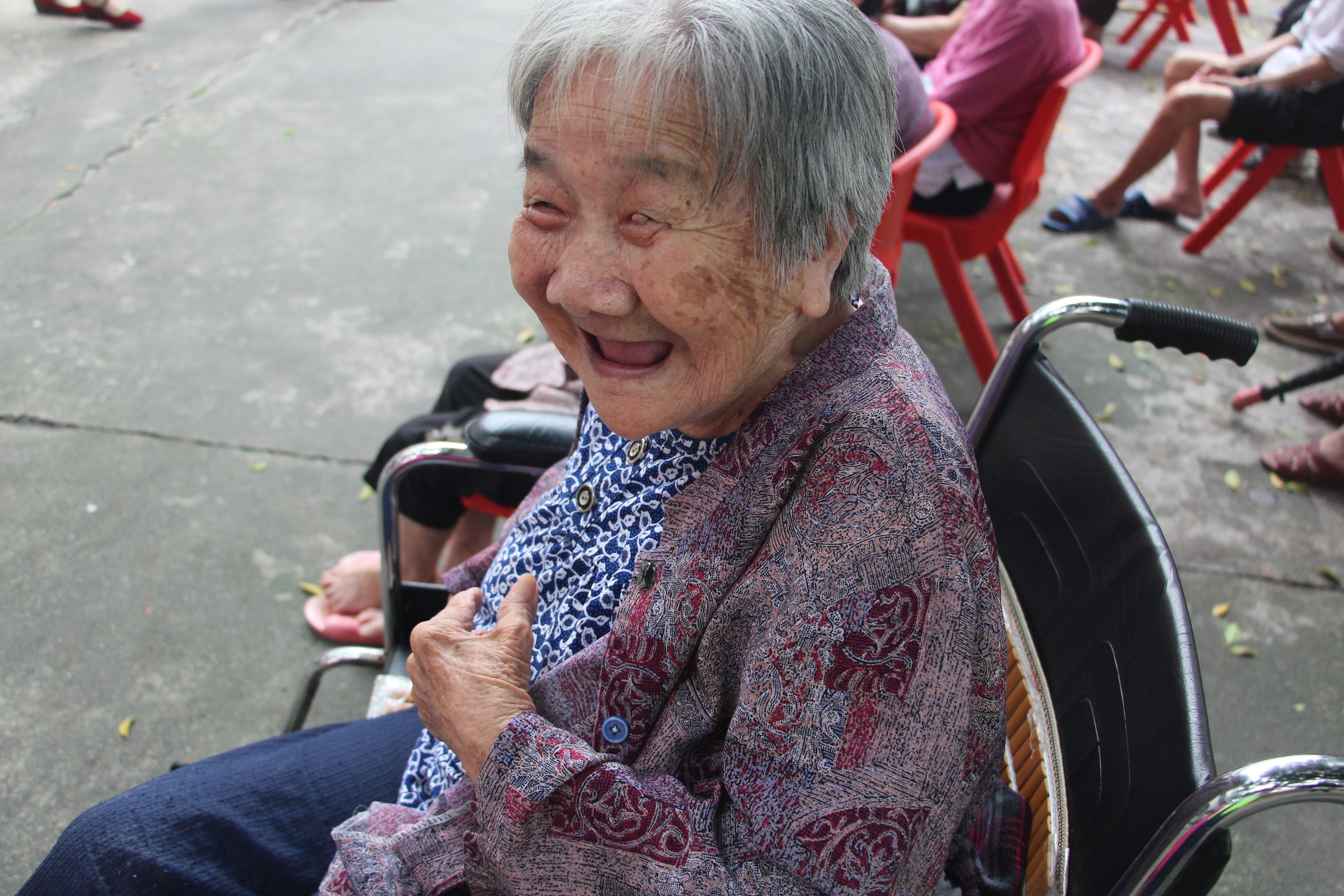 “我九十六歲了,我們以前很窮,很辛苦的,每天挑泥做苦力,就為了賺一口飯吃。你們讀大學,做一份好工作,真的很叻(棒)。有空就帶禮物來送給我們,唱歌跳舞給我們這些老人看,你們真好,謝謝你們!”