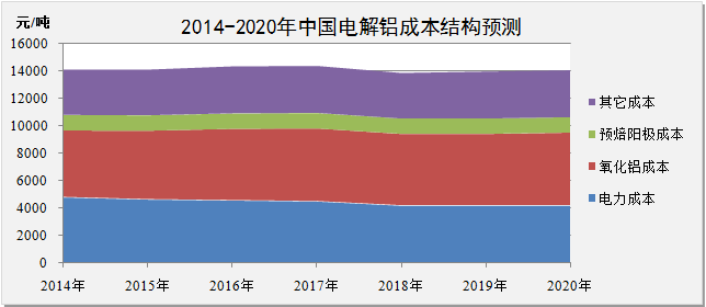 加權成本結構。2014年我國氧化鋁生產成本主要由氧化鋁、電力及預焙陽極三個方面構成。其中,氧化鋁成本為4846.4元/噸,占比34.4%;電力成本為4809元/噸,占比34.1%;預焙陽極成本為1169.6元/噸,占比8.3%。研究預測,2015-2020年期間氧化鋁成本占比將逐步提升至37.7%,電力成本占比將逐步下降至29.9%,預焙陽極成本占比穩定。
