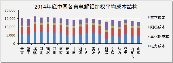 從區域電解鋁生產成本結構上看,2014年云南地區氧化鋁成本位于全國最低位,占比為27.1%;重慶次之,占比為28.2%。值得關注的是,福建地區氧化鋁成本占比為29.4%,但電解鋁加權平均成本位居全國最高位,主要原因是福建地區電力成本處于全國最高水平,電力成本占比高達43.2%。