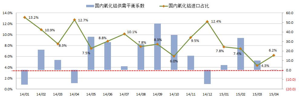3:我國(guó)氧化鋁供需平衡系數(shù)及國(guó)內(nèi)氧化鋁進(jìn)口占比變動(dòng)圖