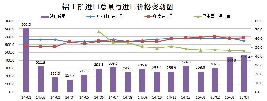 鋁土礦進(jìn)口價(jià)格或持續(xù)穩(wěn)中有降態(tài)勢(shì)。近兩個(gè)月我國(guó)的鋁土礦進(jìn)口量都維持在較高的水平。監(jiān)控?cái)?shù)據(jù)顯示,2015年4月份我國(guó)鋁土礦進(jìn)口量猛然上漲至471.9噸,同比增長(zhǎng)199.2%,環(huán)比增長(zhǎng)6.2%。其中,澳大利亞、印度和馬來(lái)西亞為主要的進(jìn)口國(guó),其進(jìn)口量占比高達(dá)93.6%,進(jìn)口價(jià)格保持穩(wěn)定并略有下降。預(yù)計(jì)鋁土礦進(jìn)口價(jià)格將保持穩(wěn)中有降趨勢(shì),但下降幅度不會(huì)很大。