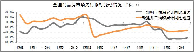 全國商品房市場先行指標出現好轉跡象。商品房土地購置面積和新建開工面積是衡量房地產市場投資開發的重要先行指標。5月份,雖然商品房土地購置面積和新建開工面積均出現32%和16%的降幅,但降幅環比均有所收窄,房地產投資開發潛力逐步好轉。總體而言,5月份全國房地產市場先行指標和銷售指標的增速均出現了轉折,但該趨勢主要體現在一線城市及部分重點二線城市方面。
