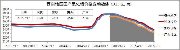 國產(chǎn)氧化鋁價(jià)格降幅收窄。監(jiān)控?cái)?shù)據(jù)顯示,現(xiàn)階段國產(chǎn)氧化鋁價(jià)格仍然維持下滑趨勢,但整體降幅有所收窄。截至7月17日,國產(chǎn)現(xiàn)貨報(bào)價(jià)2390元/噸,月化日均降幅為0.11%,較6月份收窄0.06個(gè)百分點(diǎn);貴州地區(qū)報(bào)價(jià)2339元/噸,月化日均降幅為0.06%,較6月份收窄0.11個(gè)百分點(diǎn);廣西地區(qū)報(bào)價(jià)略低于貴州地區(qū),月化日均降幅與貴州地區(qū)保持基本一致。
