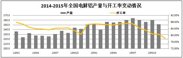 市場(chǎng)供給情況。產(chǎn)能方面,11月全國(guó)電解鋁建成產(chǎn)能約為3860萬(wàn)噸,運(yùn)行產(chǎn)能為3020萬(wàn)噸,開(kāi)工率為78.2%;產(chǎn)量方面,11月電解鋁產(chǎn)量251萬(wàn)噸,同比增長(zhǎng)3.9%,累計(jì)同比增長(zhǎng)9.9%,其中:山東、新疆、內(nèi)蒙、河南四省份全國(guó)產(chǎn)量占比63%。截至12月18日,全國(guó)電解鋁合計(jì)減產(chǎn)444.5萬(wàn)噸,占國(guó)內(nèi)總產(chǎn)能的11.5%,其影響效果將于2016年第二季度得到體現(xiàn)。