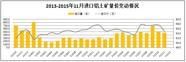海關(guān)數(shù)據(jù)顯示,11月我國(guó)進(jìn)口鋁土礦460萬(wàn)噸,環(huán)比下降了6.12%,降幅較上期收窄了21.8個(gè)百分點(diǎn)。價(jià)格方面,報(bào)告期內(nèi)進(jìn)口均價(jià)較上月普遍下降2-3美元的幅度,11月進(jìn)口均價(jià)為55美元。從數(shù)據(jù)分布上看,影響11月進(jìn)口鋁土礦量下滑的主要原因是大部分氧化鋁企業(yè)虧損,部分廠家開(kāi)始減產(chǎn),同時(shí)進(jìn)口礦石價(jià)格下跌的觀望氣氛逐步增強(qiáng)。