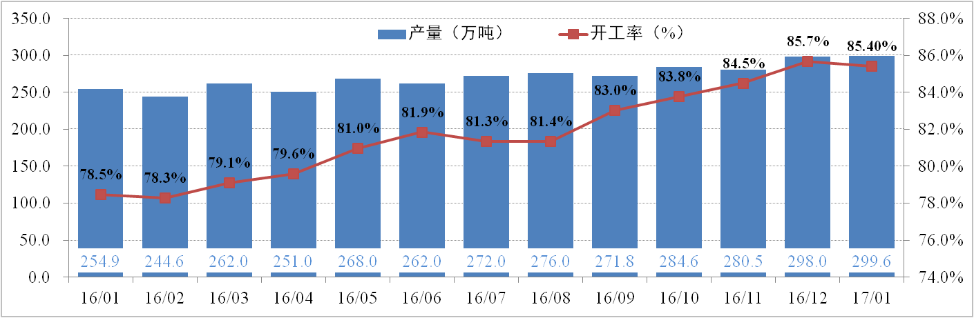 供給方面:2月10日,全國電解鋁有效產能為4,226.6萬噸,運行產能37萬37.5噸,開工率為88.42%。其中,1月份電解鋁總產量為299.6萬噸,供應持續增加。調研數據顯示,2017年電解鋁新產能已投產98.1萬噸,預計年度最終實現588.5萬噸;電解鋁復產21.2萬噸,預計年內最終實現152萬噸。