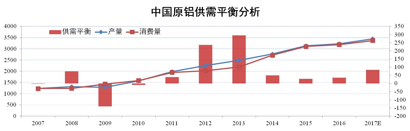 國內(nèi)原鋁供需方面:2017年,預(yù)計(jì)新增需求量在150萬噸左右,總需求量在3367萬噸左右;新增供給量在195萬噸左右,總供給量在3450萬噸左右,整體來看,2017年國內(nèi)原鋁供需方面在過剩約80萬噸。