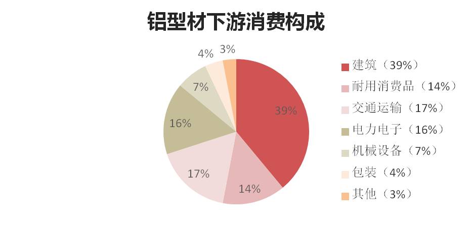2017年鋁材的下游消費(fèi)持有相對樂觀的預(yù)估,這主要還是基于對宏觀經(jīng)濟(jì)整體終端需求的偏強(qiáng)判斷。在鋁材的下游消費(fèi)構(gòu)成中,主要在為建筑和交通、電力用鋁。其中,建筑(39%)、交通運(yùn)輸(17%)、電力電子(16%)、包裝(4%)、耐用消費(fèi)品(14%)、機(jī)械設(shè)備(7%)及其他(3%)。