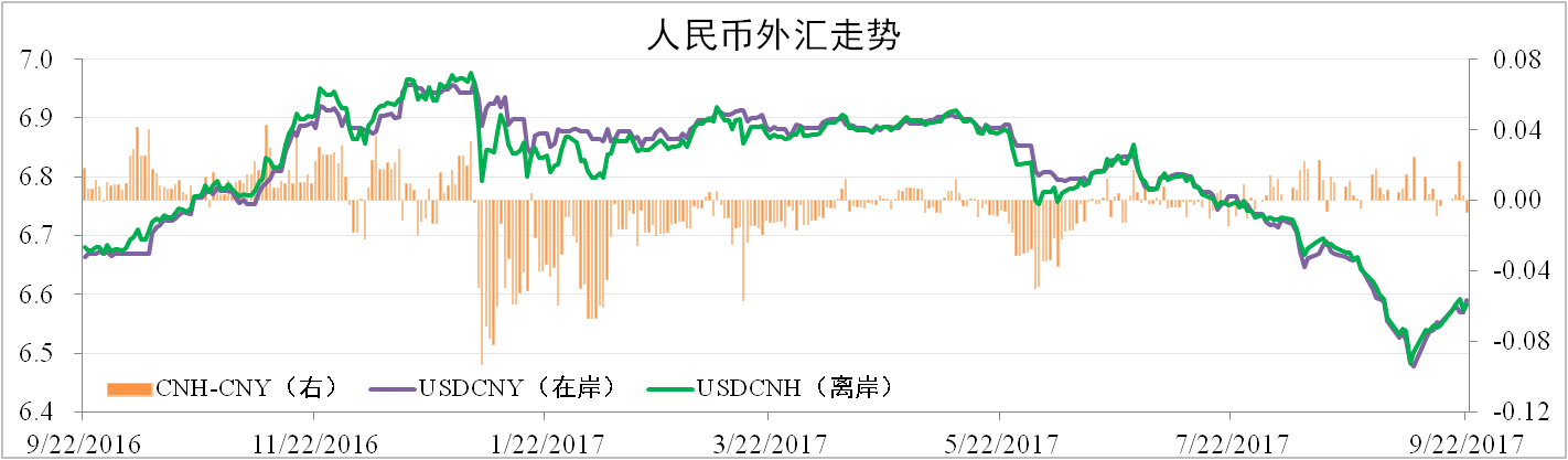 8月至9月中旬人民幣匯率呈“V”形走勢。截至9月22日,離岸人民幣匯率為6.5828,較9月7日的近一年最高點貶值1.53%,較8月22日升值1.16%。據央行通知,9月11日起,人民幣外匯風險準備金自原有20%調整至0%。