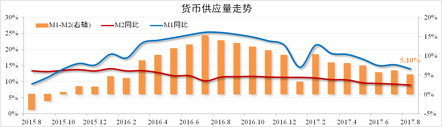 8月份M2增速為8.9%,較上月下滑0.3個百分點,M1與M2差額為5.1%,較上月縮小1個百分點。社會融資規模169.41萬億,同比上漲13.07%,其中實體經濟融資規模115.46萬億,同比上漲13.77%,較上月提升0.09個百分點。