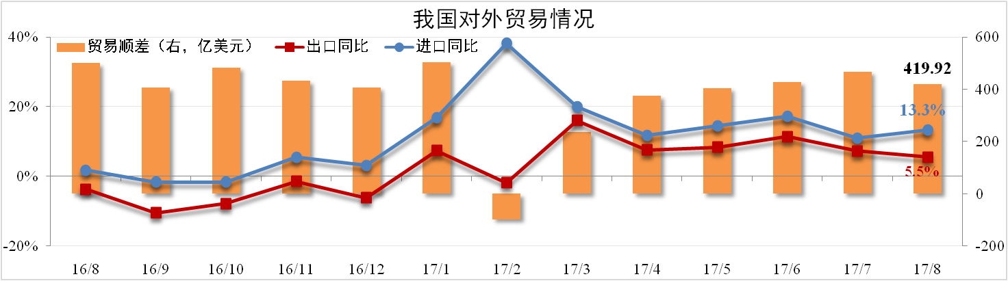 據海關總署數據,8月份我國進口量為1572.37億美元,同比上漲13.3%,較7月擴大2.3個百分點;出口量為1992.29億美元,同比上漲5.5%,較7月縮小1.7個百分點。貿易順差為419.92億美元,較上月下降10.15%。
