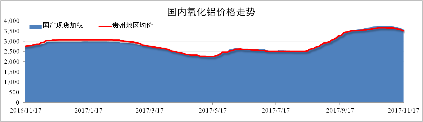 截止11月17日,國產氧化鋁現貨加權均價為3,582元/噸,環比下降3.20%。貴州地區氧化鋁現貨加權均價為3,520元/噸,環比下降2.97%。受雙節影響,10月氧化鋁市場參與度、市場熱度較前期下降,氧化鋁價格上漲明顯收窄。