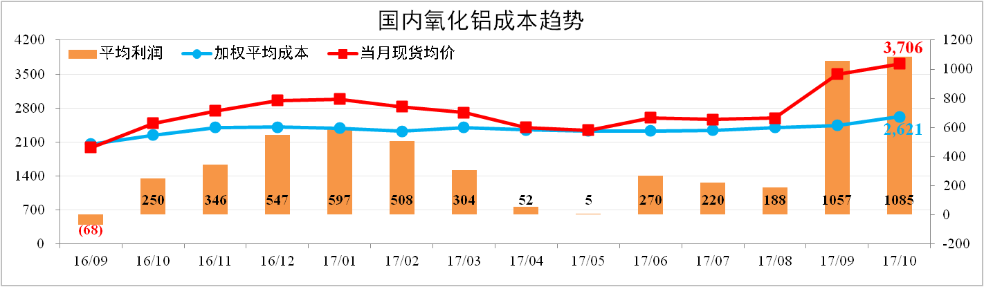 10月份煤炭、鋁土礦及燒堿價格繼續上漲,導致氧化鋁成本增加。國內氧化鋁行業加權平均成本漲至2,621元/噸,環比上漲7.29%。全國氧化鋁現貨成交均價達到3,706元/噸。理論上,氧化鋁行業平均利潤水平約1,085元/噸。