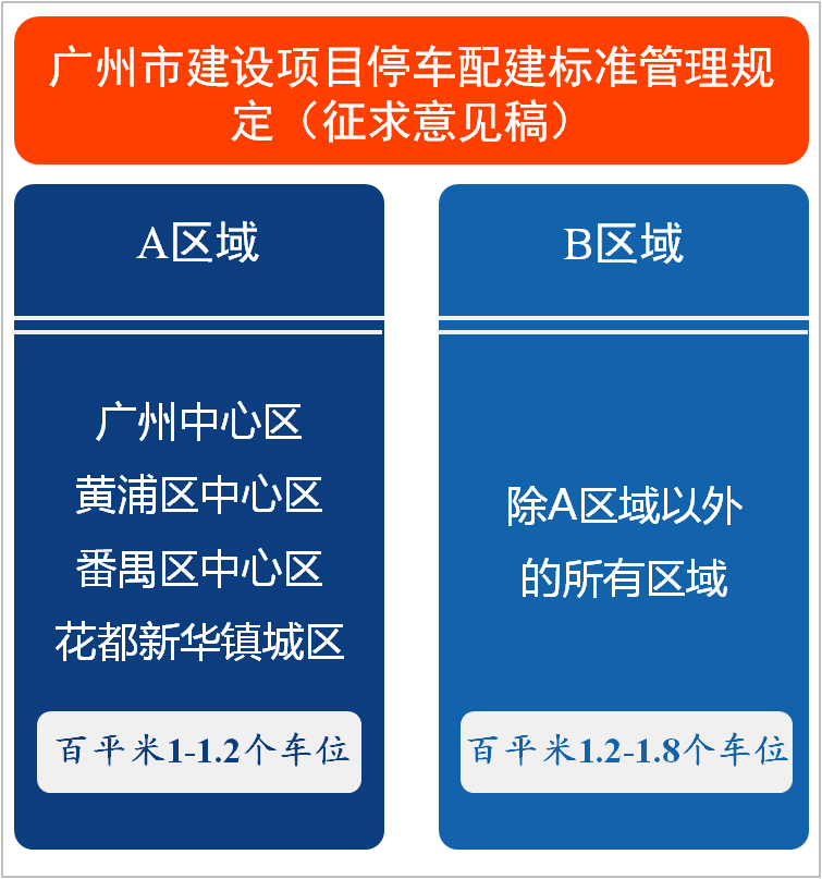 11月17日,廣州市政府發布《廣州市建設項目停車配建標準管理規定(征求意見稿)》。規定新建、改建、擴建的住宅類建設項目及大于500平方米的公共建筑類、工業建筑類建設項目,按A、B兩區域進行劃分規定。