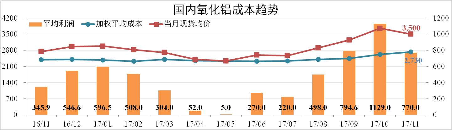 11月份國內(nèi)氧化鋁加權(quán)平均成本為2,730元/噸,環(huán)比上漲4.16個百分點(diǎn)。當(dāng)月全國氧化鋁現(xiàn)貨成交均價為3,500元/噸,較上月下跌5.56%。理論上,氧化鋁行業(yè)平均利潤水平為770/噸。