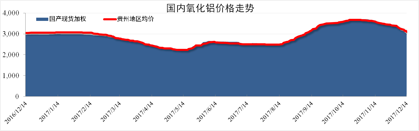 截至12月14日,國產(chǎn)氧化鋁現(xiàn)貨加權(quán)均價為3,000元/噸,同比上漲0.9%,環(huán)比下跌16.78%。貴州地區(qū)氧化鋁現(xiàn)貨加權(quán)均價為3,300元/噸,同比上漲1.3%,環(huán)比下跌13.41個百分點(diǎn)。