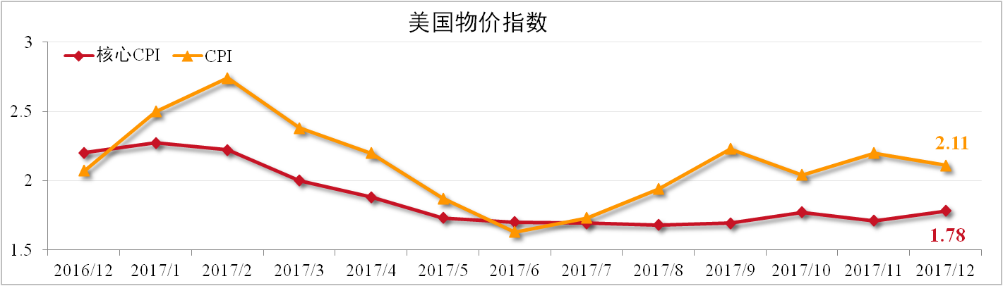 12月美國(guó)CPI為2.11%,較上月下滑0.09個(gè)百分點(diǎn)。剔除能源和食品的核心CPI為1.78,較上月擴(kuò)大0.07,超出市場(chǎng)預(yù)期。2017年全年美國(guó)零售銷售增長(zhǎng)4.2%,為3年最大漲幅。