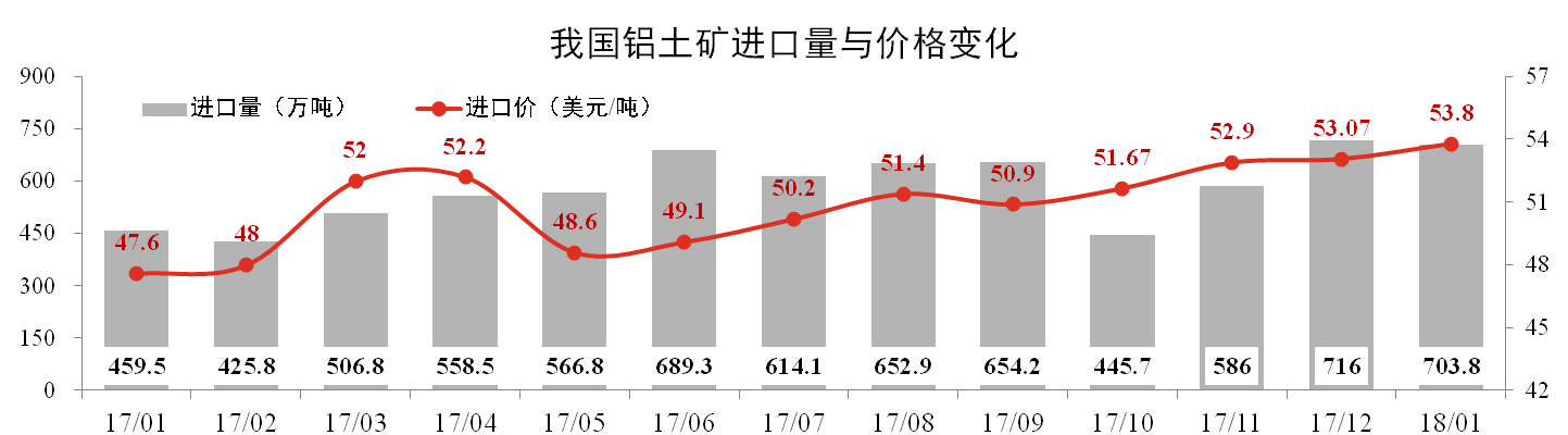 1月份我國鋁土礦進口量為703.8萬噸,同比增長53.17%,環比下降1.75%。進口均價53.8美元/噸,環比上漲1.4%。當月幾內亞鋁土礦進口量再創歷史新高至350萬噸,占當月總進口量的49.73%。