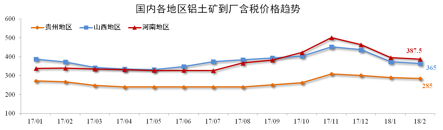 2月份各地鋁土礦價格保持下調。截止2018年2月,貴州(AL:60%,A/S:5.5-6)到廠含稅價月均價285元/噸,環比下降2.06%;山西鋁土礦365元/噸,環比下降2.38%;河南鋁土礦387.5元/噸,環比下降2.07%。