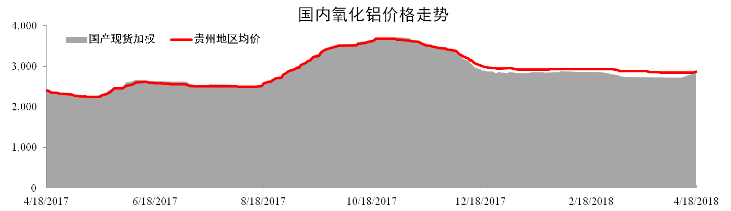 截至4月18日,國產氧化鋁現貨加權均價為2895元/噸,同比上漲18.03%,環比上漲5.82%。貴州地區氧化鋁現貨加權均價為2,867元/噸,同比上升19.36%,環比下跌0.46%。