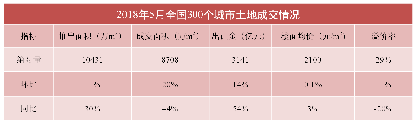 5月全國300城市土地市場總成交面積為8,708萬㎡,環比增加20%,同比增加44%。其中,住宅用地成交面積3,110萬㎡ ,環比增加18%,同比增加74%。土地溢價率為29%,較上增長11個百分點,同比收縮20個百分點。