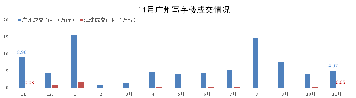 11月,廣州一手寫字樓成交4.97萬m²,環(huán)比增加22%;其中海珠區(qū)一手寫字樓成交0.05萬m²,環(huán)比減少74% 。