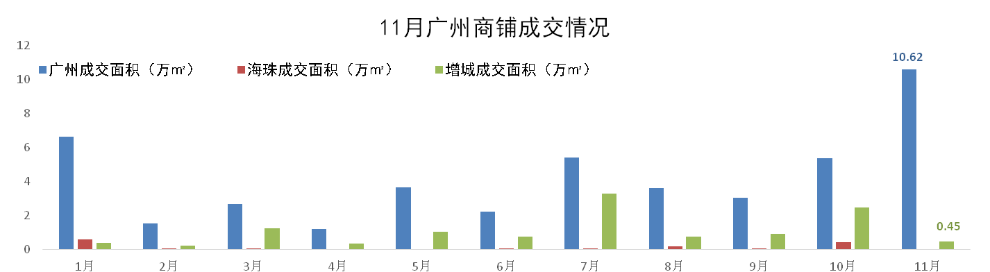 11月廣州一手商鋪成交10.62萬㎡,環(huán)比增加54%。按區(qū)域劃分,增城區(qū)一手商鋪成交0.45萬m²,環(huán)比減少81%,占全市成交量不足一成。按商鋪類型劃分,社區(qū)商鋪成交占比8成。