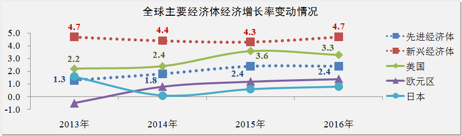 國際貨幣基金組織(IMF)在2015年全球經(jīng)濟發(fā)展展望預測報告中指出,目前全球經(jīng)濟呈現(xiàn)出四個趨勢:一是石油價格自去年9月份以來下跌近55%;二是全球經(jīng)濟增長基本符合預期,但主要經(jīng)濟體增長情況存在顯著差異;三是美元退出QE后幣值上升近6%;四是新興經(jīng)濟體的利率及風險利差逐步上升。IMF預計2015-2016年全球經(jīng)濟增長率分別為3.5%和3.7%。相比2014年10月期《世界經(jīng)濟展望》的預測,IMF對全球經(jīng)濟增長率下調了0.3個百分點。之所以做出這種調整,是因為對中國、俄羅斯、歐元區(qū)和日本經(jīng)濟前景做出了重新評估。應引起注意的是,美國是唯一增長預測上調的主要經(jīng)濟體。