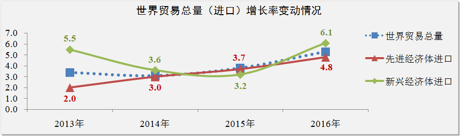 IMF數(shù)據(jù)顯示,2015-2016年世界貿易總量(貨物和服務)將會出現(xiàn)較快增長趨勢,增長率分別為3.8%和5.3%。受石油價格及大宗商品價格下跌對貿易條件和實際收入的負面影響,預計2015年新興經(jīng)濟體對世界貿易增長的貢獻將低于先進經(jīng)濟體,增長率為3.2%。隨著負面影響逐步化解,預計2016年新興經(jīng)濟體的貿易增長率將快速回升至6.1%。