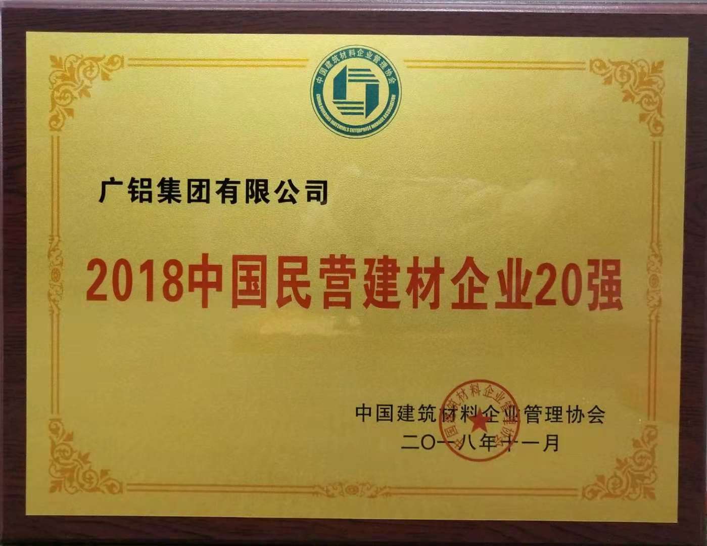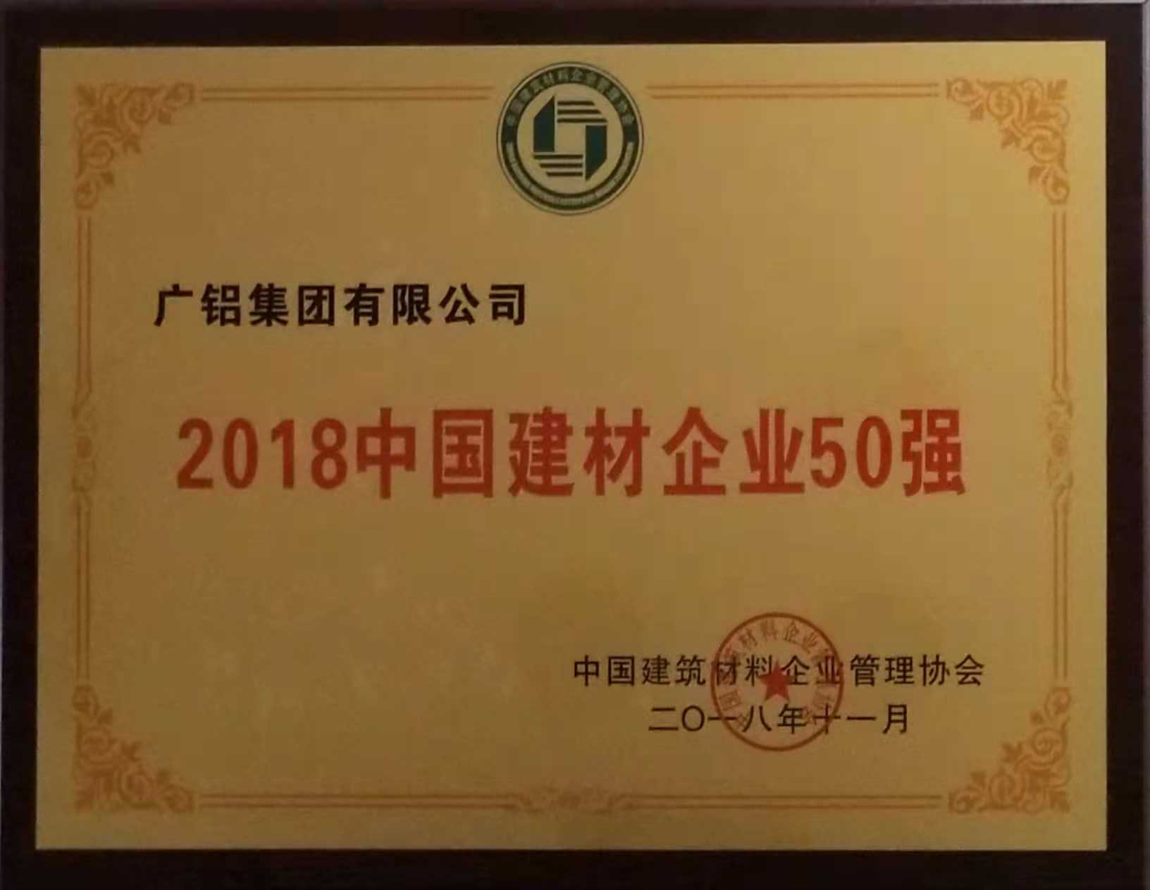 廣鋁榮獲“2018中國建材企業(yè)50強”、“2018中國民營建材企業(yè)20強”、“2018中國建筑鋁型材10強”稱號