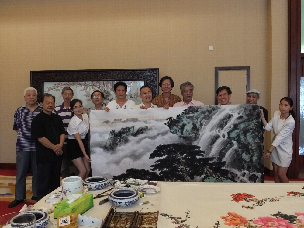 在廣州畫壇,李筱孫、葉泉、許固令、陳永康、盧德平、招熾挺、黃樹文、陳永鏘、陳孝能九位畫家常常在一齊談藝論道,因而被行內人雅尊為“羊城九老”。幾十年來,九位畫友一直以文會友,以畫交心,情誼深厚。此次“羊城九老”應邀光臨廣鋁集團總部,葉鵬智董事長盛情接待了他們,并就集團的發展歷史、經營戰略、企業文化向他們做了介紹;葉董事長還與他們一起用餐、座談。隨后“羊城九老”便在展廳里談笑風生、吟詩作對并聯手作畫贈予公司留作紀念。其畫雖由九人聯手所作,卻猶如出自一人之手,渾然天成,氣勢不凡,可見他們的畫藝是何等精湛、情誼是何等深厚!九位畫壇耆英年紀雖已過半百,但他們依舊笑笑鬧鬧,直言不諱,童心未泯,表現出藝術家對待人生的樂觀曠達。
